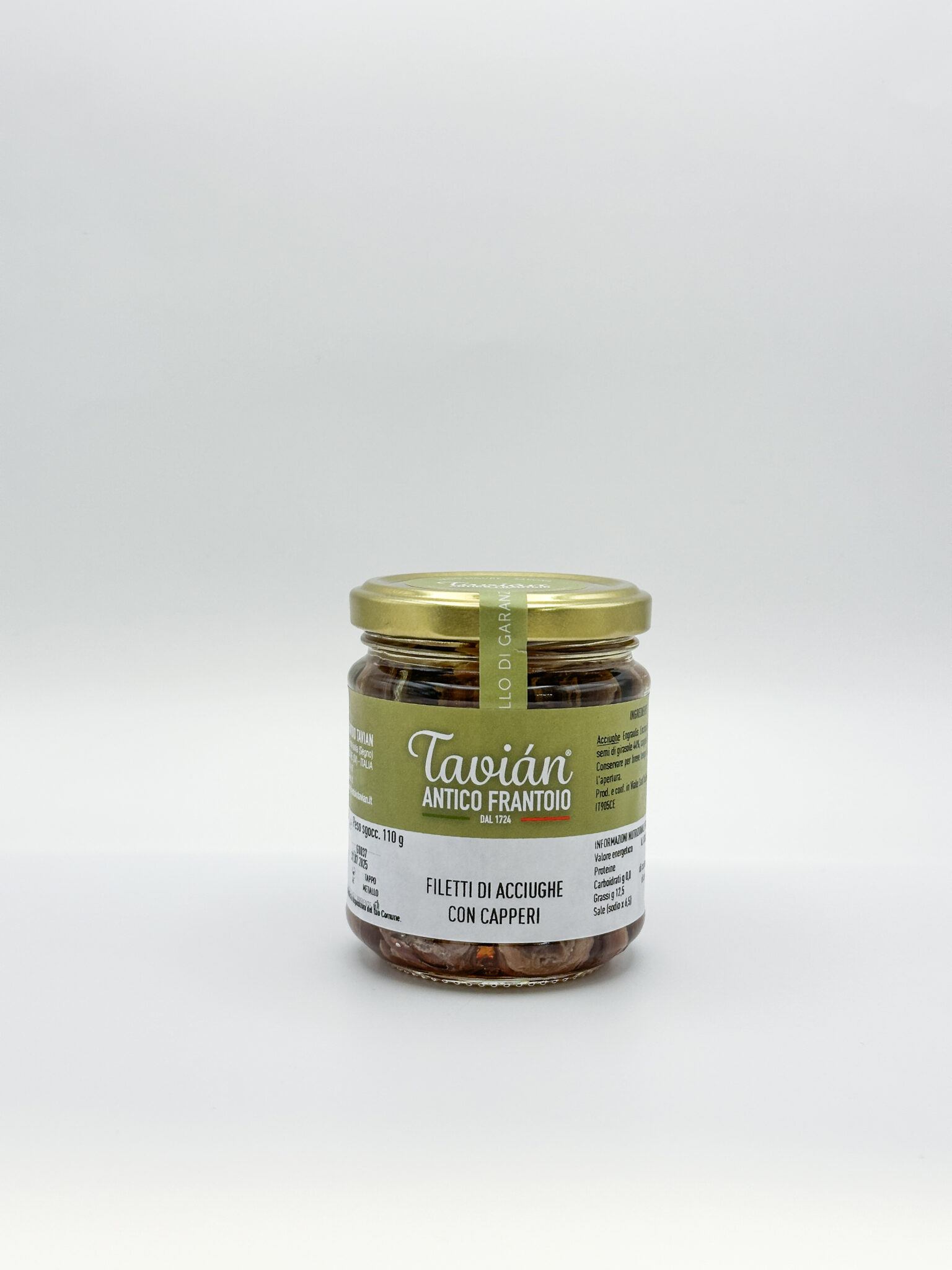 Ingredienti: Acciughe Engraulis Encrasicolus 45%, olio di semi di girasole 44%, capperi 10%, sale. Conservare per breve tempo in frigorifero dopo l’apertura.